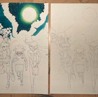 Part of the reason why my paintings take me so long is I build my layers up extremely slowly. I've gotten a bit quicker in the last year or so as I make more paintings and get a better feel for watercolor as a medium and the process I've picked up along the way, but I still have the tendency to work slow and tediously. I added a very subtle texture to the moon using a darker shade of yellow and built up the layers of leaves in the trees. I wanted there to be multiple sections of different intensities of lighting, with the very edge being the most illuminated by the moon and the leaves in the middle and at the bottom being engulfed by a mysterious darkness. I also added some more texture and shading to the road and its cracks. I remember being really intimidated by the road because it was a large part of the painting that was just a big chunk of flat color. I tried my best to give it some variety and realistic texture so it didn't stand out as too much of an eye sore. I was pleasantly surprised by how it came out! Other than that, more texture, more shading, more lighting. Rinse and repeat. Once I was happy with where it was, I removed the masking fluid on the characters and shifted my focus towards them.