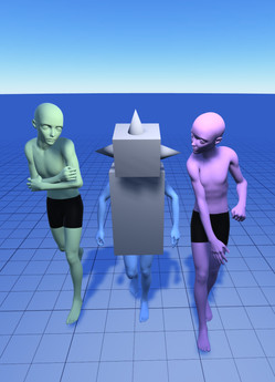 Once again, I just kept on adding shading layer by layer. I remember being especially happy with that little line of shadow coming from Cosmo's robot head. I used a bit of ochre and red to soften the edge of the shadow and give it a warmer appearance. Johnny's jumpsuit was a bit tricky because I wanted to make it apparent that it was meant to be that classic dark blue while also keeping the lighting consistent, and I had a hard time balancing that with the hair as well. Andy might be my favorite, though! He looks so washed out in the light and theres something about how the green looks that puts him perfectly in the environment, plus I love how the red pops with the green and the white of the face paint. Another addition were their shadows on the ground. I used that 3d software and put a light source in the rough position I wanted it to be in to get an idea of what sort of shadow would be cast in that environment. I feel like the soft edges with ochre and red make the lighting even more prominent and really helped to tie the whole thing together!